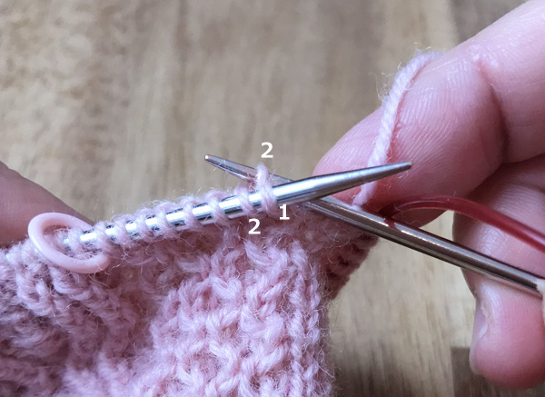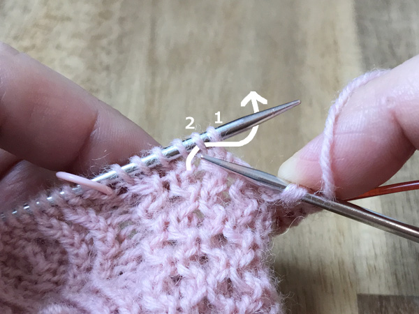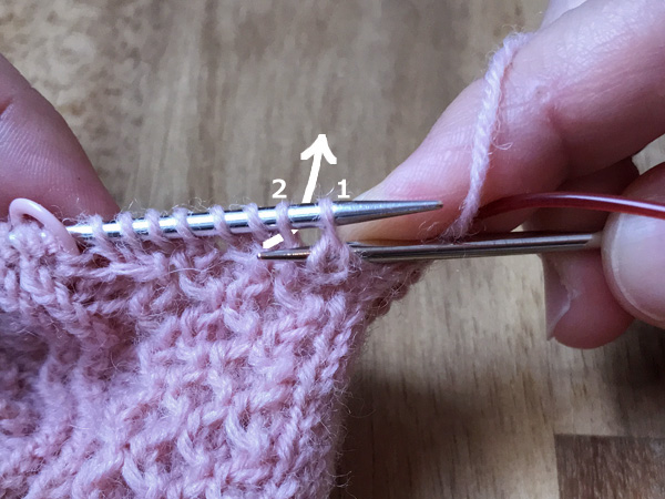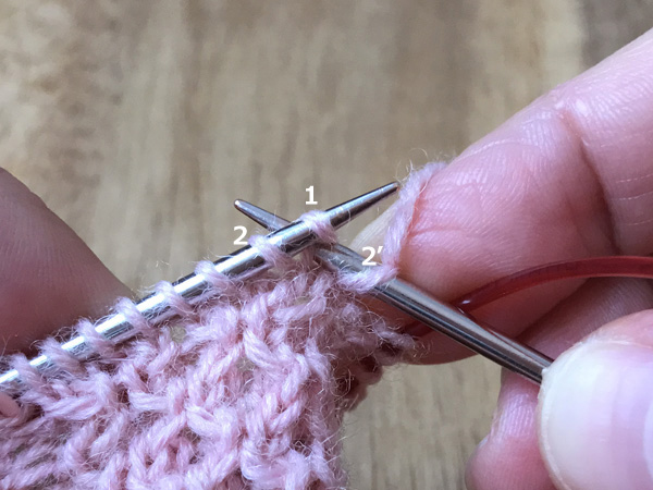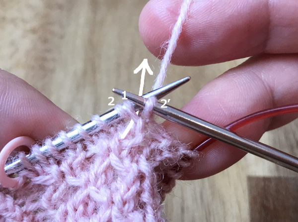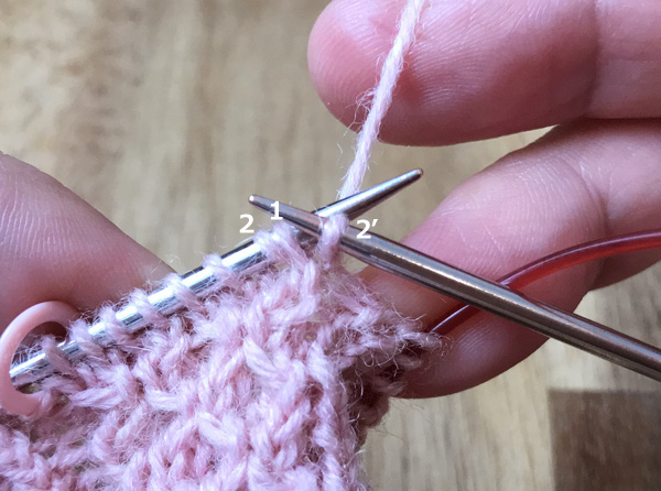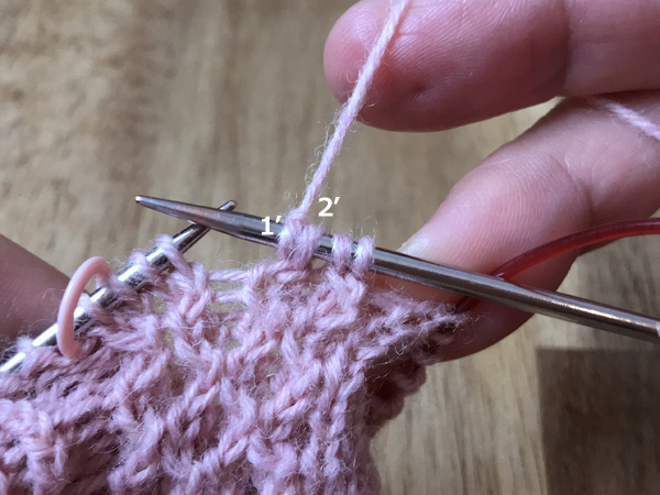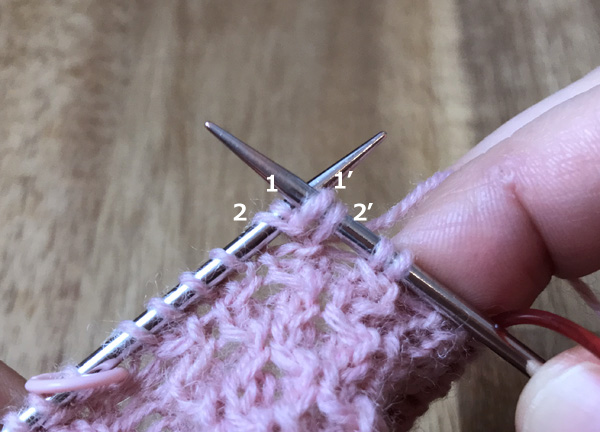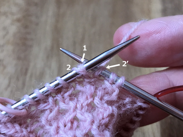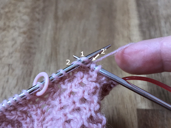 1. 左針にかかっている最初の目(1)と次の目(2)の間に、後ろから矢印のように2に針を入れ表目を編む(2’)
