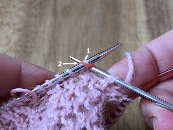 2. 2の目より前に出ないよう、右針を1の目に入れ表目を編む。