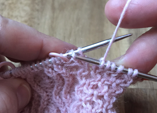 なわ編み針などの道具を使わない、右上1目交差の編み方(1/1 Left Cross, 1/1 LC)