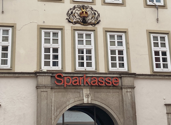 ドイツ全土で大きく展開している銀行のSparkasse シュパーカッセのゲッティンゲン支店。ちなみに、銀行とは関係ありませんが、入り口の上にある装飾には、“17 In der Crone von England 49”(『イングランドの王冠、1749年』とかそんな意味)と書かれていて、1749年に作られたものだとか。ここは、ハノーファー選帝侯でありイギリス国王だった君主たちが、ゲッティンゲンを訪れたさいに宿泊していたHotel zur Croneがあった場所らしいです