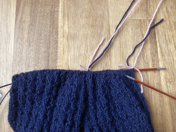 さて、つま先は色変えです。つま先の色はカラー1、つまりピンクの糸に変えます。それ以外は、一段ごとに減らし目をしていく普通のつま先の編み方なので、とくに問題なさそう。明日には編めちゃえるかな。