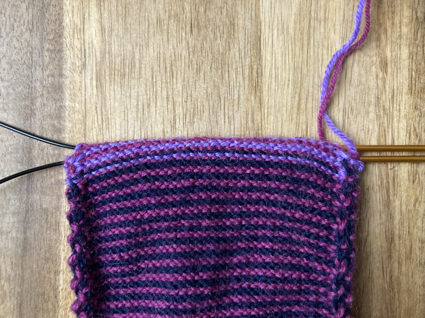 色変えは、カラー2の赤紫はそのままで、カラー1である紺の糸を切ります。そこにカラー3を加えて、カラー1の代わりにカラー3とカラー2を使って編んでいく、という感じになります。色が変わっただけで、4段一模様という編み方は同じです。