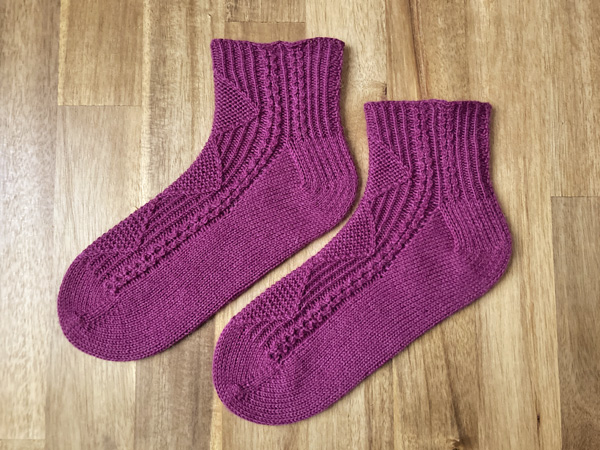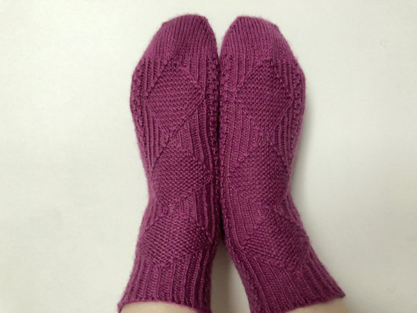 本来なら、ダイヤ模様はもう一模様編みたかったところですが(サンプル写真では、ダイヤ模様が四つある)、三模様だけにしておきました。短いくつ下になりましたが、履く分にはとくに問題ありません。模様も含め、かなり気に入っています。次に編むことがあれば、絶対四模様は編むぞ。