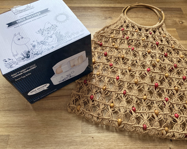 購入したのは、ムーミン絵柄のゆで卵メーカーと、麻っぽい糸で編まれたマクラメのバッグです。