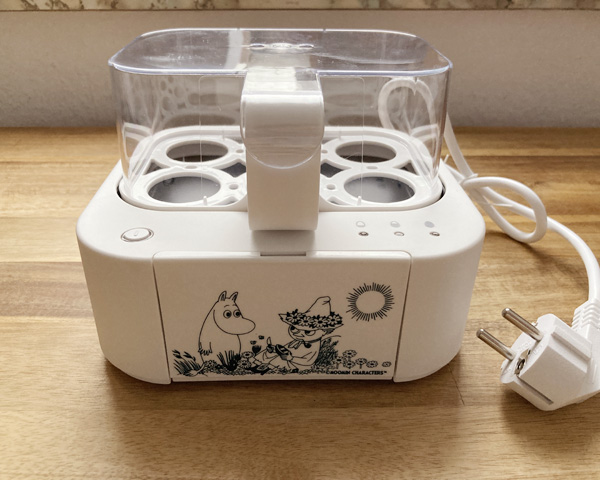 そこに現れたのが、このムーミン絵柄のゆで卵メーカーですよ。こんなものがあるのかと驚き、吸い寄せられるように手に取りました。お店の人から、『それは€13、新品よ』と言われ迷いました。そのへんで売っているゆで卵メーカーは、安いものは€10くらいからあるので、それを考えるとちょっと高いと思ったからです。€12くらいなら何とか出せるか、と思って交渉したらOKとの返事だったので、わりとあっさり購入を決めました。8年も迷っていたのにねえ。とうとうゆで卵メーカーを手に入れちゃった! いまの部屋のキッチンは狭くて置くところがないので、当分使うことはないかもしれないのがちょっと残念。でもそのうち使ってみようと思っています。