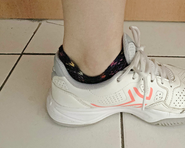 履いてみると、このくつ下の評判の良さがよーく分かりました。丈が思っていたよりも短くて少々驚きましたが、履き口にi-cordがあることで、簡単にはスポッと抜けないようになっているんですね。また、スニーカーの履き口の曲線にウツボソックスの履き口の形が沿うように同じ曲線を描いていて、ウツボソックスを履いていると、スニーカーのどこかが足に直接当たることがありません。すごい。スニーカーを履いてこそ、ウツボソックスの本領発揮だと実感しました。