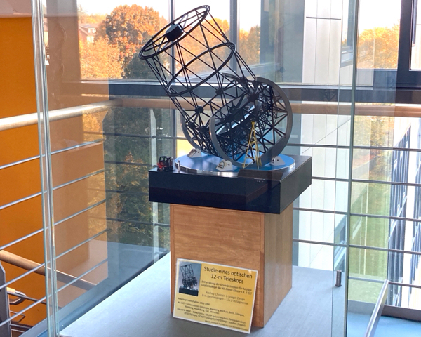 ノーベル賞受賞者を多数輩出していることもあってか、夫が仕事をしている学内には、フーコーの振り子以外にもこういった科学的なものがいくつか展示されています。下の写真は、ドイツ(と書いてあるけど、おそらくゲッティンゲン大学)で設計研究された12 mの天文学用望遠鏡の模型です。
