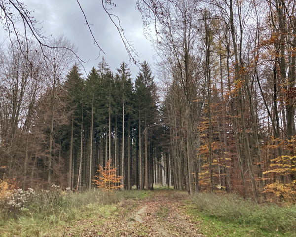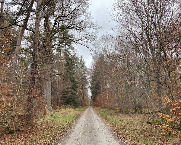 ゲストハウスを出て近くの集落を抜けたら、もうそこは森(ドイツってこういうことが多い)。思っていたよりも木々が多く(当たり前だ)、ただの散歩のつもりがこんな道(下の写真)を約5 kmも歩いていかなければならないのかと臆する私。