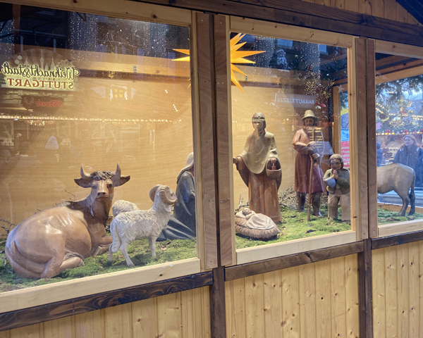 さて、クリスマスマルクトの話になりますが、たくさんのいろんなお店が並ぶなか、その一角にはイエス・キリスト降誕の場面 Weihnachtskrippeが人形によって展示されています。シュトゥットガルトは複数の場所に展示されていて、たぶんいくつかあるうちの二つを見かけました。違いがあってちょっとおもしろい。