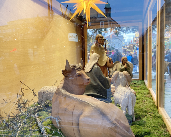 まずひとつは、東方の三博士がいない降誕場面。こんな展示の仕方もあるんだと驚きました。これまで、ケルンやマインツ、ゲッティンゲンなどで降誕場面を見てきましたが、東方三博士がいないのがちょっと不思議な感じです。ちょうどケースの窓枠でマリア様のお顔が写らず……。