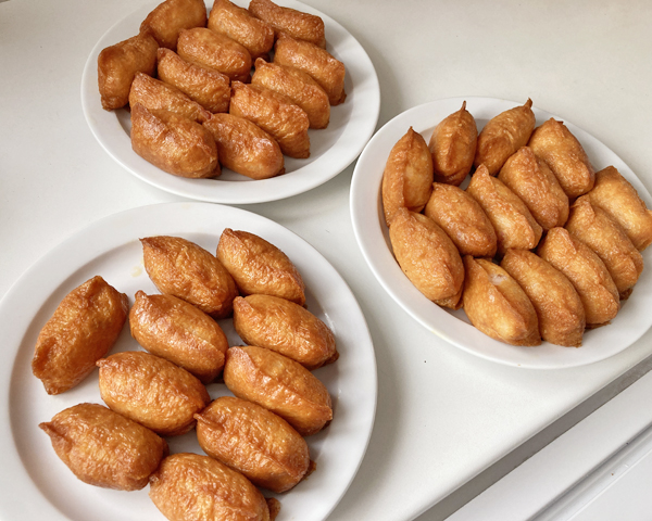 今回作っていて分かったことは、お揚げを湯煎するときは沸騰したお湯を使うと、温まったお揚げがふっくらして袋が開けやすくなるということ。これはいままで気づいてなかった! お揚げの袋には、「袋のまま60℃くらいのお湯に5分ほど浸け、温めてからお使いください」とあるのでいつもそのとおりにしていて、そうすると12枚中5~6枚くらい破けてしまうのが常だったのです。しかし、今回は熱湯で湯煎してみたら、お揚げが温まってふっくらしたからかとても開けやすくなり、破けた数は12枚中1~2枚と激減! しかも、破けたといってもほんのちょっと穴が開いた程度で済んだのです。これはすごい。いつもお揚げが開にくかったのは、温めが足りなかったからなのか!と悟りました。自分で言うのもなんですが、良いところに気づいたと思う! 重要なのは、お揚げを高温で湯煎すること、コレです。よーし、次回も熱湯で湯煎しよーっと。