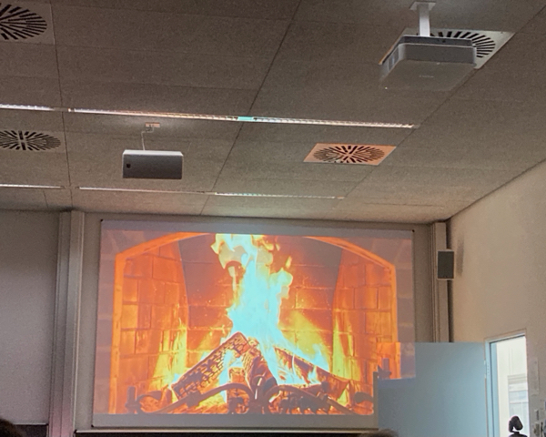まずは夫が所属する研究所所長から、スクリーンを使っての挨拶と今年の総括が。総括の一つに、今年新たに所属した人たちの紹介もあって、もちろん夫も紹介されていました(妙に安心した 笑)。挨拶が終わったあと、食堂に参加者全員集まっての記念撮影。そしてシャンパンで乾杯したあと、いよいよ食事のスタート。