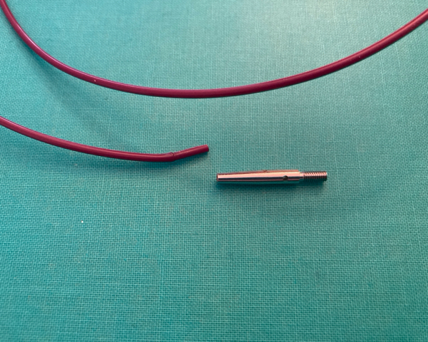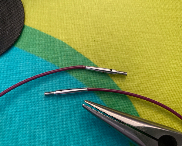 3目ゴム編みまでは80 cmケーブルでも何とかなっていましたが、これだけ目数が増えるとさすがにそれだと編みづらくなるだろうとケーブルを100 cmに変えました。ここで事件が。かかっていた目を寄せようとして80 cmケーブルを引っ張ったさい、金属のネジ部分がスポッと抜けてしまいました。えー、こんな壊れ方あるぅ?