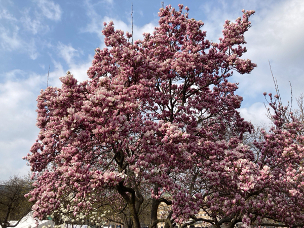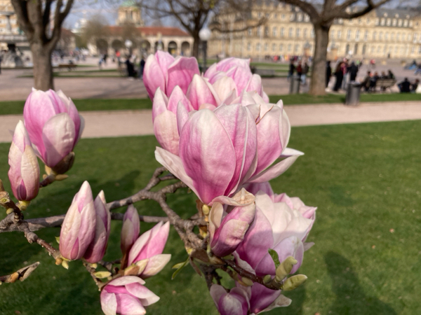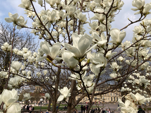 先日、散歩中にSchlossplatz 宮殿広場を通りかかったら、木蓮が満開を迎えていて、たくさんの人たちの被写体となっていました。