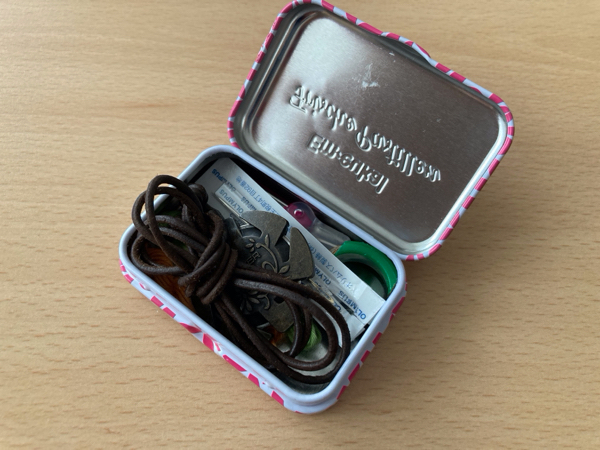 この缶、縦約5 cm、横約7 cm、深さ約2 cmと手のひらに収まるくらいの大きさです。元々はWaldbeeren(日本語ではエゾヘビイチゴのことらしいけど、野いちごとは違うのか?)味のミントタブレットが入っていたものです。これは、裁縫箱のなかで行方不明になりがちな指貫と糸通し器を入れるために買ったものでした(ミントタブレットは一気食いした)。
