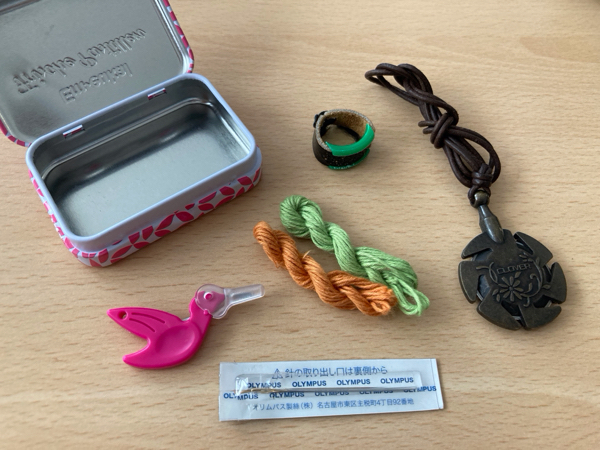 で、今回持ち歩くのに、もともと入れていた指貫と糸通し器のほかに、刺し子に使う道具(刺し子針、刺し子糸二種、ヤーンカッター)も入れてみたら、これがピッタリ収まったの! あとはこれに、ペラっとした一枚を折った刺し子の生地を持っていくだけ。まさか、こんなにちんまりとまとまるとは。