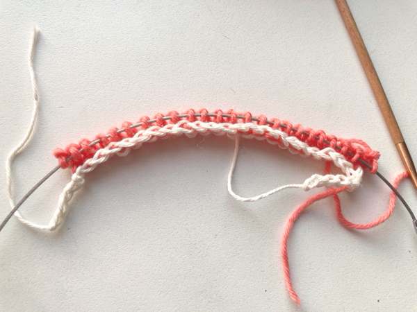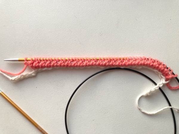 そう、平編みでメリヤスを3段編んで、裏側を正面にして目を拾っていくのです。しかし、String of Heartsには、4段編むと書かれています。それでもいいんだ!と驚き、ひとまずやってみることに。なお、パターンではProvisional COは4 mm針を使用し、すぐに3 mm針に変えてメリヤス編みをすると書かれていますが、私はあみものホットラインにあるように4 mm針でメリヤスを編んでから3 mm針に変えました。