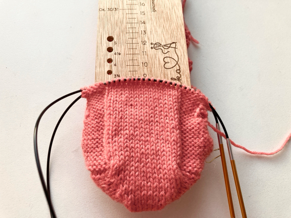 さて、Foot部分は定番の編み方とはちょっと違った足裏を編むことになるためか、足長より6 cm短い長さまで、とパターンには書かれています。ということはつまり、私の足だと目指すは17 cm。6 plyのおかげで1段の目数が少ないので、一気に編んでしまいたいですね。がんばろう〜。