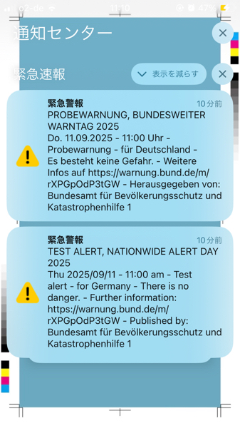 昨日2025年9月11日午前11時に、連邦政府の市民防護・災害救援庁 Bundesamt für Bevölkerungsschutz und Katastrophenhilfeが発する、緊急警報のテストがドイツ全土で行われました。これは、緊急事態や災害の差し迫りや拡大があったときに、連邦政府から個人個人のスマートフォンに警報が届くもので、2022年から毎年行われています。過去には2022年12月8日、2023年9月14日、2024年9月12日に実施されました。昨年のは下記記事で紹介しています。
