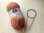 昨日(2025年9月24日)の投稿で書いた、メリヤスで編むくつ下ですが、すぐに編み始めました。で、かかとまで編み終わりました。頑張ったのではなく、メリヤス編みをずっと続けていけるのがうれしくて楽しくて、編んでいるときは夢中だった、というだけです。ローカル線に乗ってちょっと遠出をする予定があったので、毛糸玉と輪針をを持っていき、電車の待ち時間や車内で編んでいました。もちろんそれだけでここまで編めたわけじゃなく、自宅でもいろんなことをしながらちょこちょこ編んでいたら、ここまで進められました。メリヤス編みがずっと続く箇所でよく『メリヤス砂漠』と悲観的に言われがちですが、私にとっては『メリヤス天国』。あー、なんて楽しいんだ。明日には片方が編み上がると思います。