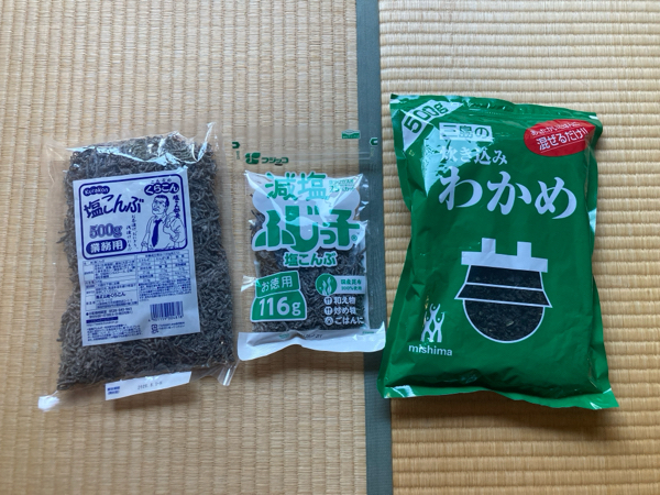 塩昆布は徳用サイズ(500 g)があるのを知っていていつも買っていたんですが、今回わかめご飯の素徳用500 gを初めて見つけて大歓喜! いつも店頭で見かける小さいサイズを10袋とかまとめて買ってたのに、これは徳用を買うでしょう! もちろんをそちらを選んで買いました。500 gって買うたびにすごく多いように思うんですけど、塩昆布はいつも半年ほどで使い切ってしまうし、きっとわかめご飯の素もそうだろうと思って、今回はどちらも気合入れて二袋買いました。それが上の写真。比較のために、母が普段買っている減塩の塩昆布徳用サイズ(116 g)と大きさを比較してみました。かえって分かりづらいか。