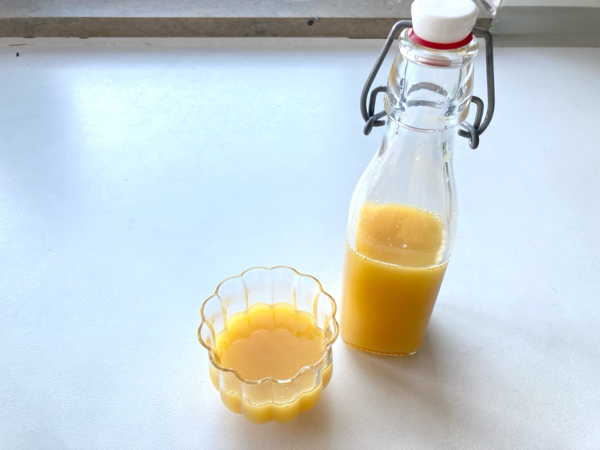なので、今度こそは家で作ろうと思って、さっそくオレンジジュース(行ったスーパーには濃縮還元しか売ってなかったのでそれを……)を買ってきました。使ったものは、上の写真の後ろに並んでいる三つ。外で飲んだときの味を思い出しながら作ってみたら、思いの外うまくできたので、自分用に作り方をメモとして残しておくことにしました。ドイツ語でレシピを探してみると、オレンジと生姜を絞って作っていたり、シナモンやターメリックを入れるような本格的なものばかり(いわゆる“丁寧な暮らし”っぽい)ですが、自分で飲むのにそんな面倒なことはしたくない(笑)。我が家はジンジャージュース(生姜のしぼり汁)は常備しているので、あとはオレンジジュースさえ買ってくればすぐに作れるよう、既存のいくつかのレシピを参考にちょっとだけアレンジしました。