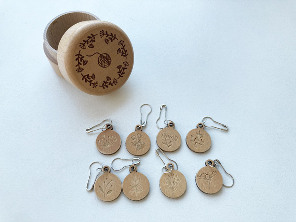 木製のスティッチマーカーとその入れ物も、絵柄がカワイイ。スティッチマーカーは全部絵違っていました。ヤーンホルダーもそうでしたが、このスティッチマーカーと入れ物は(安いだけあって)端や表面がざらつきところどころ毛羽立っていたので、軽くヤスリ(400番)をかけました。これで使いやすくなったゾ。