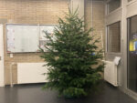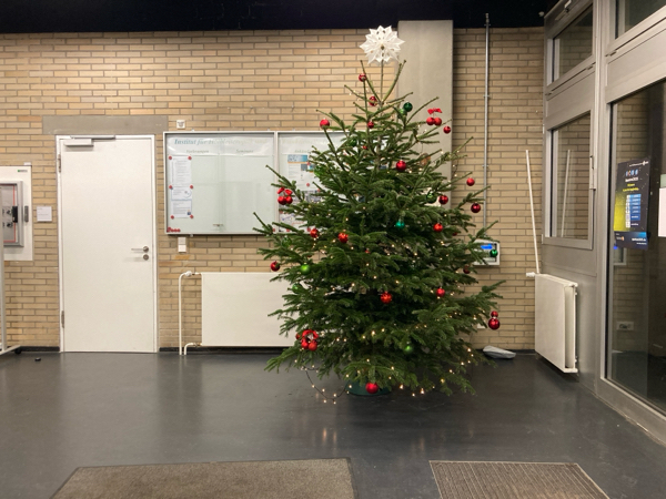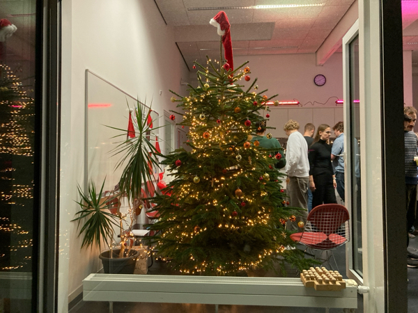 そういえば、夫の研究所の入り口にあった、飾り気もなかったツリーがおめかししていました。さすがにパーティーのときくらいはね。
