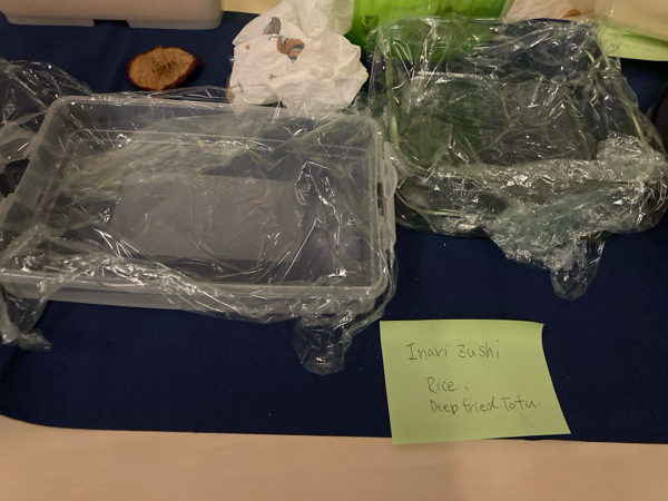 持って行ったいなり寿司。昨年は30個以上作って持って行きましたが、思ったほどの売れ行きじゃなかったので、今年は少なめに22個にしました(24個作って、破れた2個は自分たちで食べた)。どうせ余ってるだろうから自分たちで食べようと思ってたのに、見事に空っぽ。さすがに50人くらいに22個じゃ少なかったか……。空になった入れ物を見て、ガッカリとうれしさが同居する不思議な感覚を味わいました。次はまた30個以上作ろう。