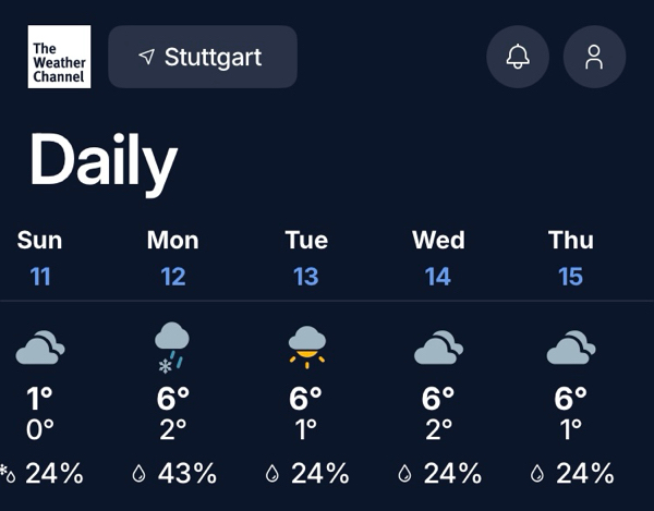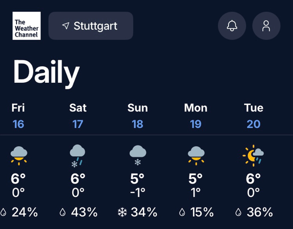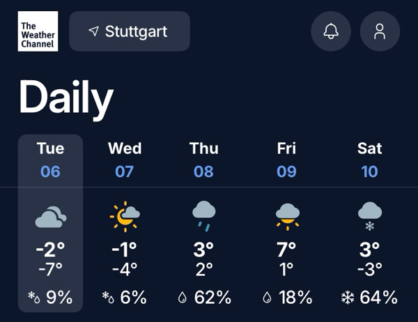 そういえば、ドイツってすごく寒い日もすごく暑い日も、だいたい二週間しか続かないんだった。今回も今冬一の冷え込みは約二週間で終了ってことみたいですね。あともうちょっとでこの寒さが終わると思うと、ちょっと頑張れる。