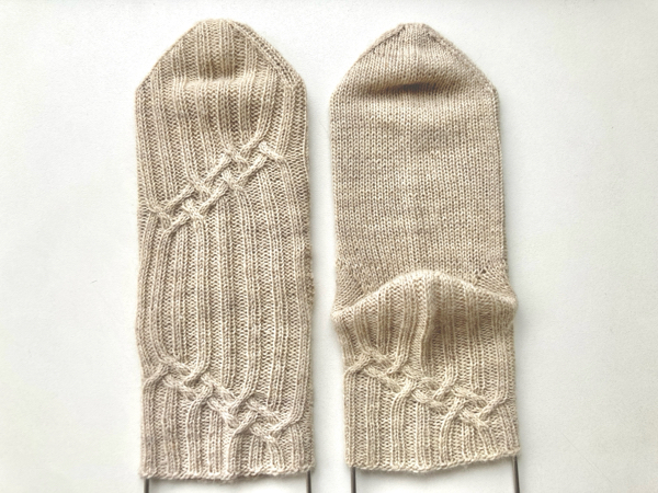 このくつ下は、交差編みが左右対称で入っていて、なかなか華やかな編み地です。編むのは少々複雑でしたが、出来上がったのを見ると満足。