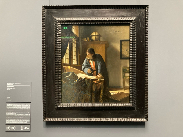 今回訪問の目的は、フェルメールの絵画『地理学者 Der Geograph』。実はシュテーデル美術館にやって来たのは二度目で、一度目のさいにこの絵を見ることができず美術館を後にしてしまいました。これがずーっと心残りで、絵の話になるたびに、地理学者が見たいんだー、見たいんだーと夫に言っていてたんです。今回、ようやくそれが叶いました。