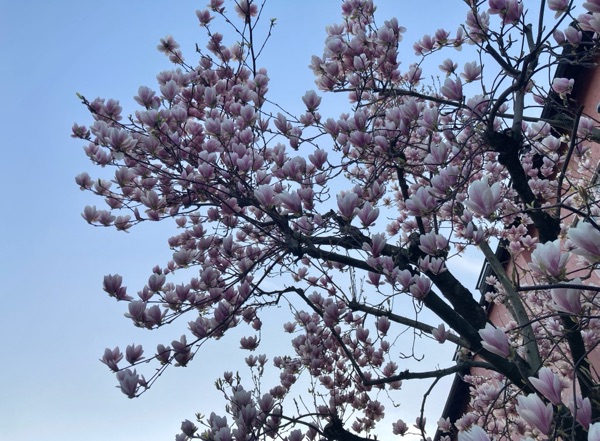 昨日は夕方から用事があって出かけたのだけど、普段はあまり使わない道を歩いていたら、モクレンと思われる花が満開でした。